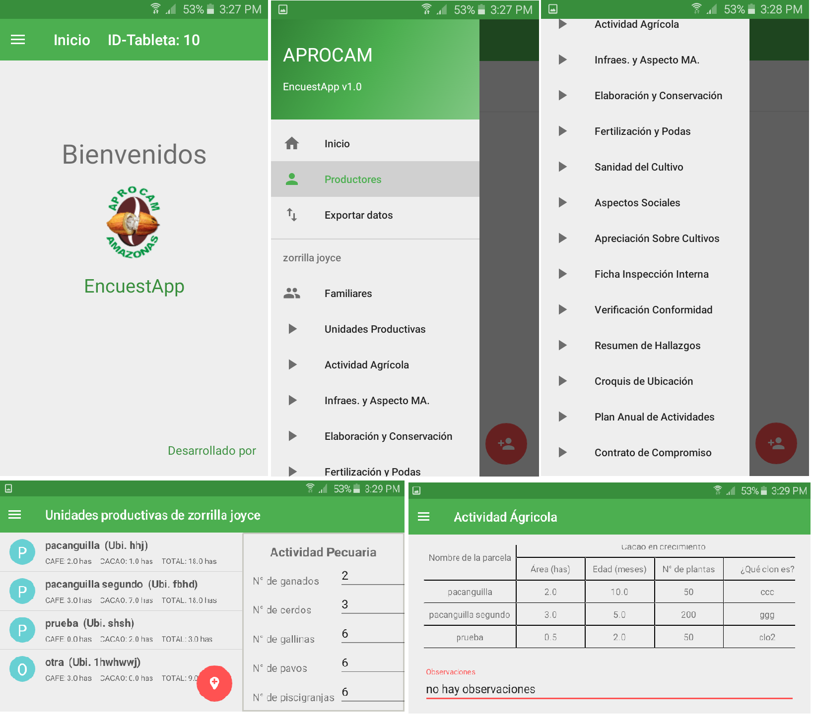 Registra y actualiza información del productor y actividades y los almacena temporalmente en el dispositivo, luego por conexion WI-FI es exportado a un servidor de base de datos.